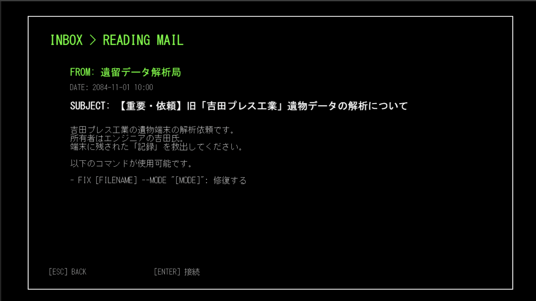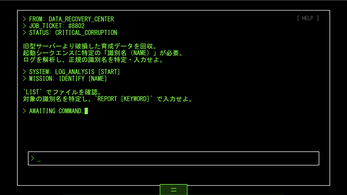 本ゲームは、作中の仮想端末(ターミナル)にコマンドを入力することで進行します。